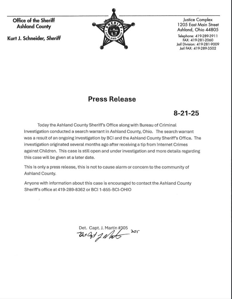 Ashland County, Ohio – On August 21, 2025, the Ashland County Sheriff’s Office, working in cooperation with the Bureau of Criminal Investigation (BCI), executed a search warrant in Ashland County as part of an ongoing criminal investigation.