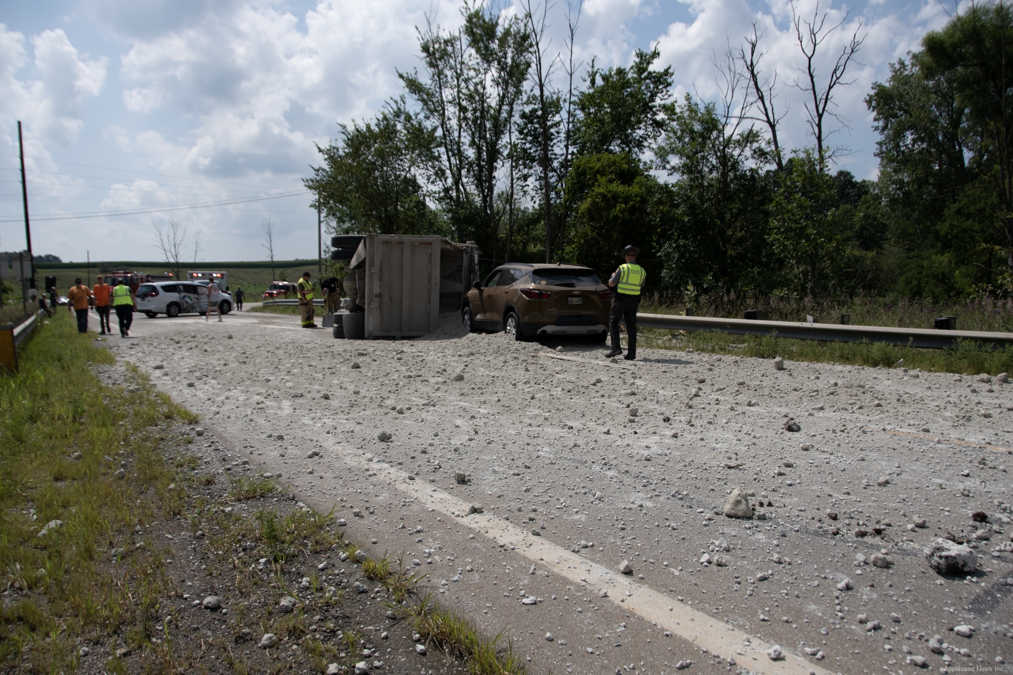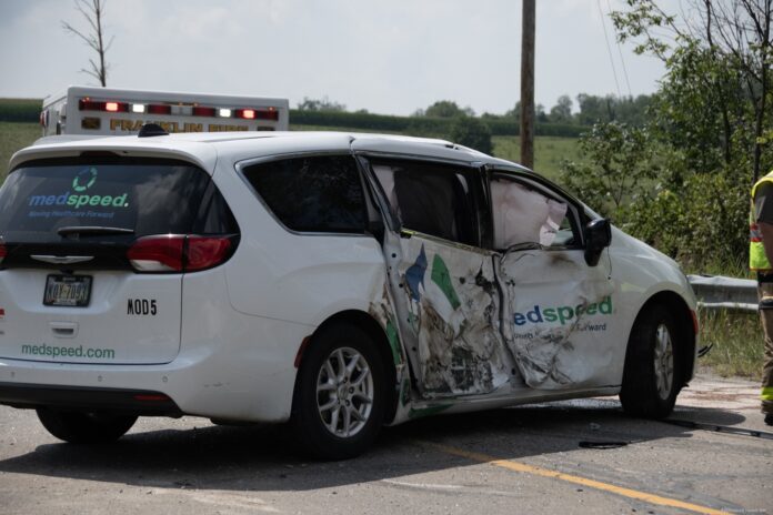 The crash happened around 1:57 p.m. and involved three vehicles: a 2025 Chrysler Voyager minivan, a 2005 Kenworth T-800 dump truck, and a 2019 Chevrolet Blazer.